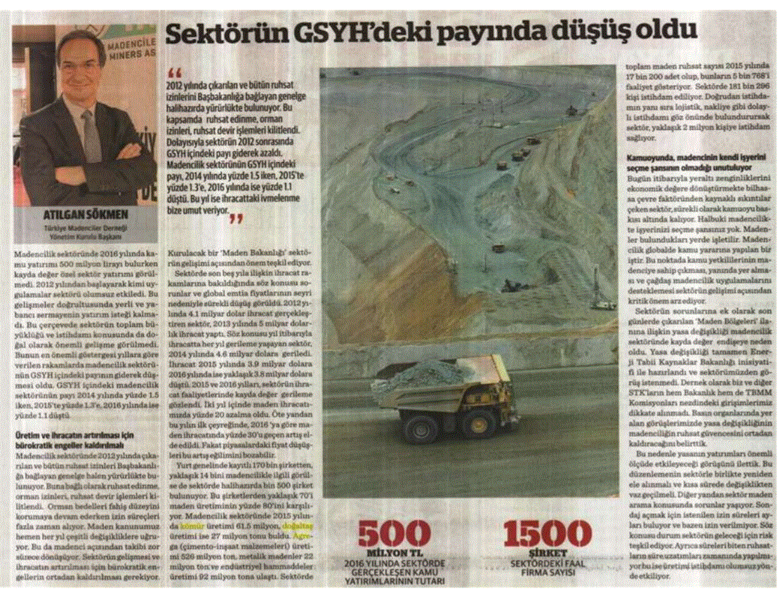Derneğimiz Başkanı Atılgan SÖKMEN Dünya Gazetesinin Madencilik eki için röportaj verdi
