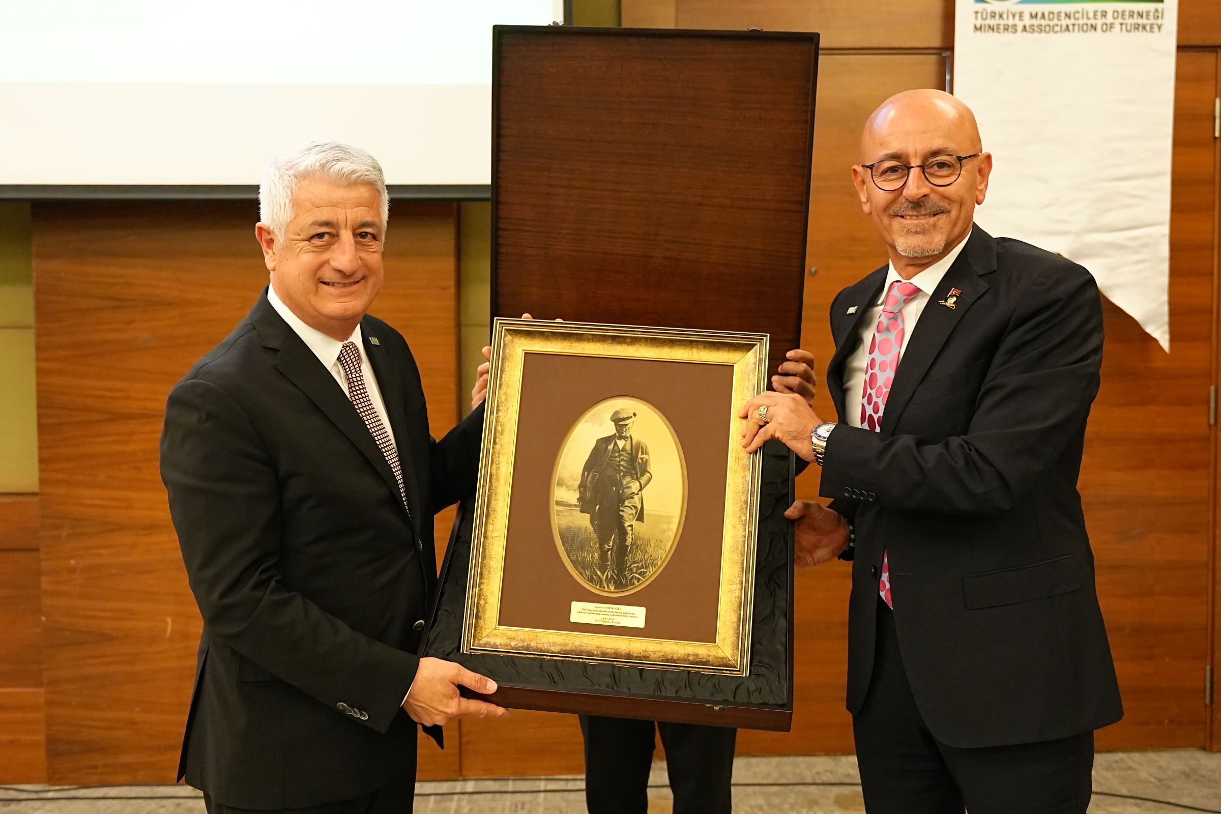 Yılmaz, başkanlık görevini devraldığı Ali Emiroğlu’na, madencilik sektörü ve TMD’ye hizmetlerinden dolayı teşekkür plaketi takdim etti.